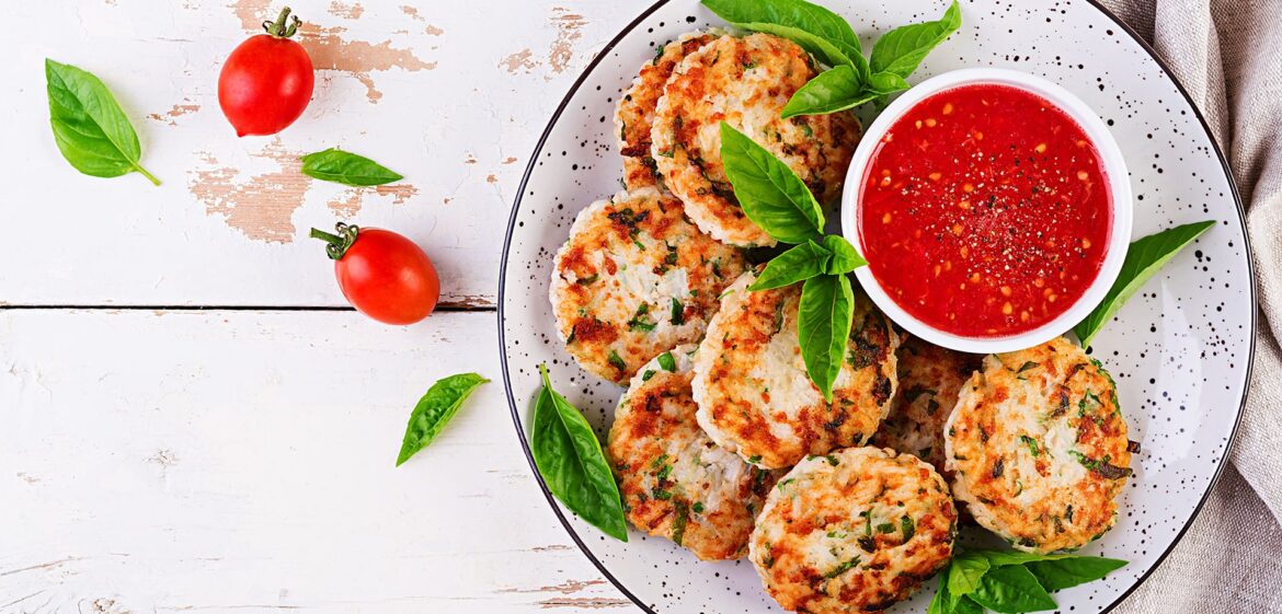 Delicious rice and chicken meat patties with garlic tomato sauce